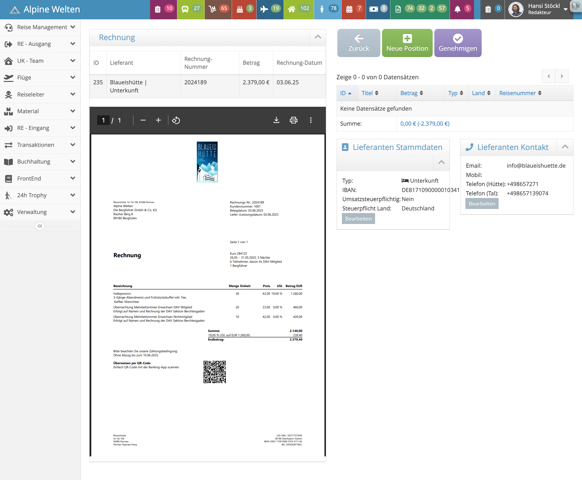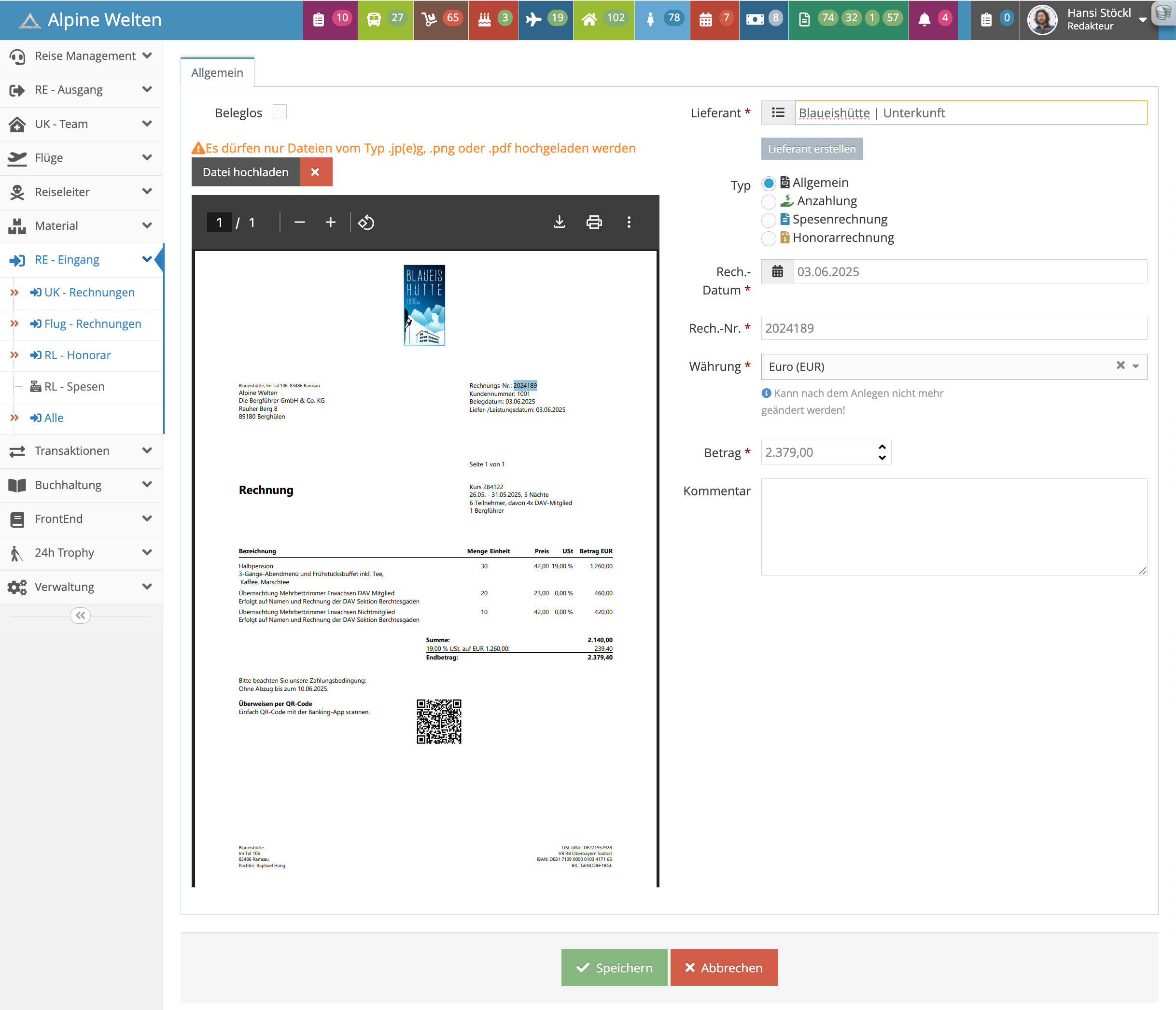 Eingangsrechnungen (z. B. für Unterkünfte, Flugtickets, Transfers) müssen im AW Manager korrekt erfasst und mit einer Reisenummer verknüpft werden. Jede einzelne Rechnungsposition muss einer eindeutigen Reise zugeordnet sein.